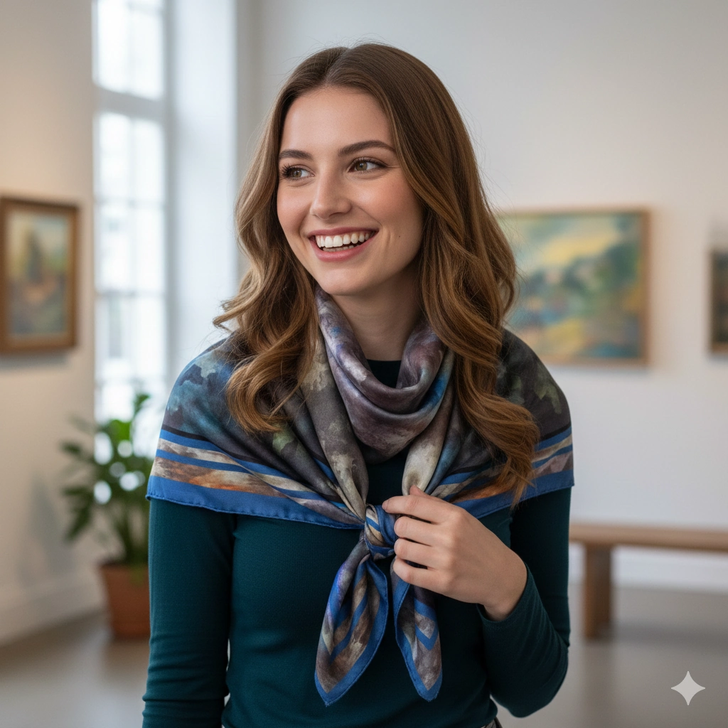 Designed for the discerning individual, this scarf is crafted from the finest 100% Mulberry silk, renowned for its incredible softness, natural sheen, and breathable comfort. Every detail is handled with care, featuring hand-rolled hems that provide a sophisticated, high-end finish. Measuring a generous 90x90 cm, its versatile size allows for endless styling possibilities—whether draped over the shoulders, tied as a classic neck scarf, or worn as a statement headpiece.