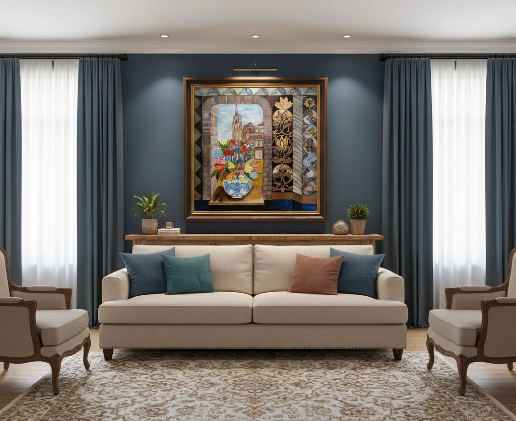 The painting harmonizes cool blues and warm earth tones, balancing the structured architectural elements and organic floral compositions.